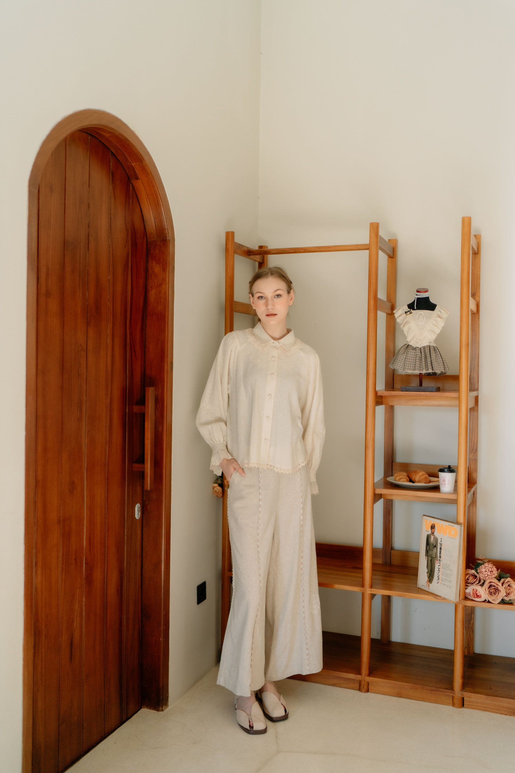 Top basic vintage dengan kerah shirt renda, dengan detail kancing di bagian belakang. Dikombinasikan dengan cotton motif. Kancing bagian depan. Busui friendly.